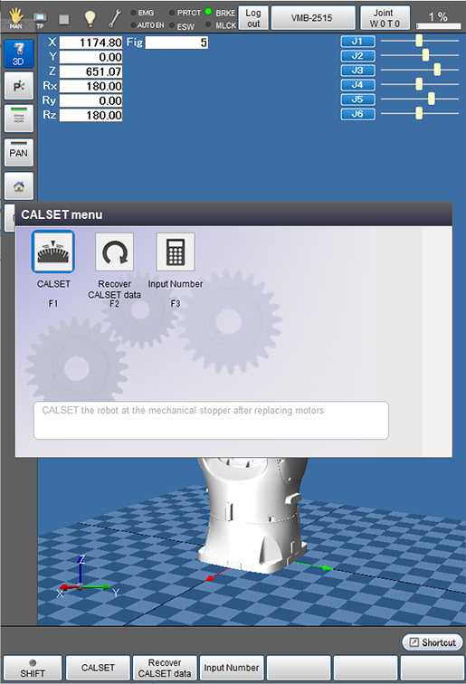 This CALSET is done when encoder system down occurs. Bring the joint, where the system failure occurred, to the near mechanical end, and press [Recover CALSET data] to restore encoder condition similar to the original condition. |