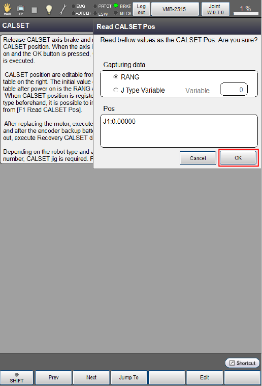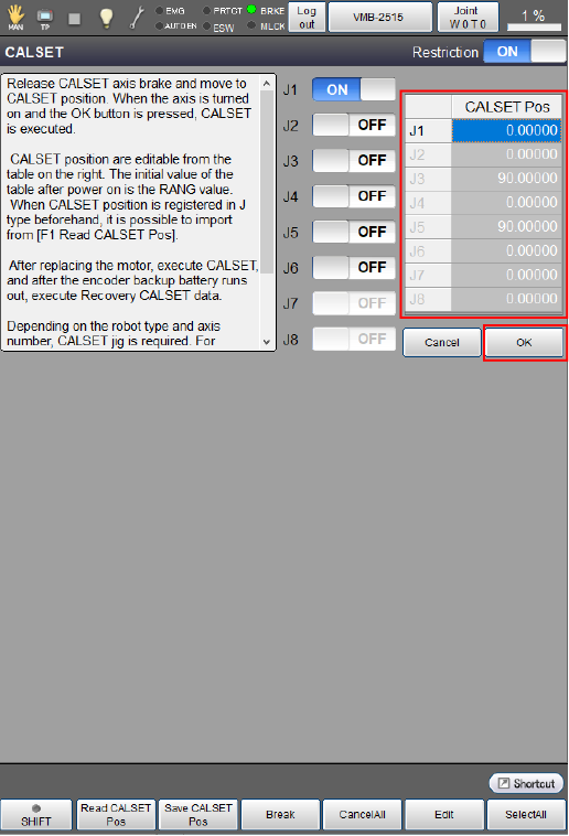 Change all joints to [CALSET (ON)]. Change it to [ON] and press [OK] to execute CALSET. |