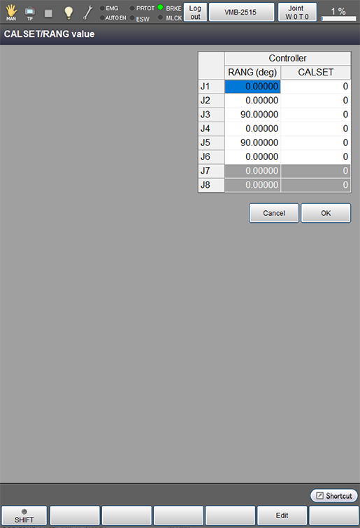 Enter RANG and CALSET values of robot directly from numeric keypad to set them.