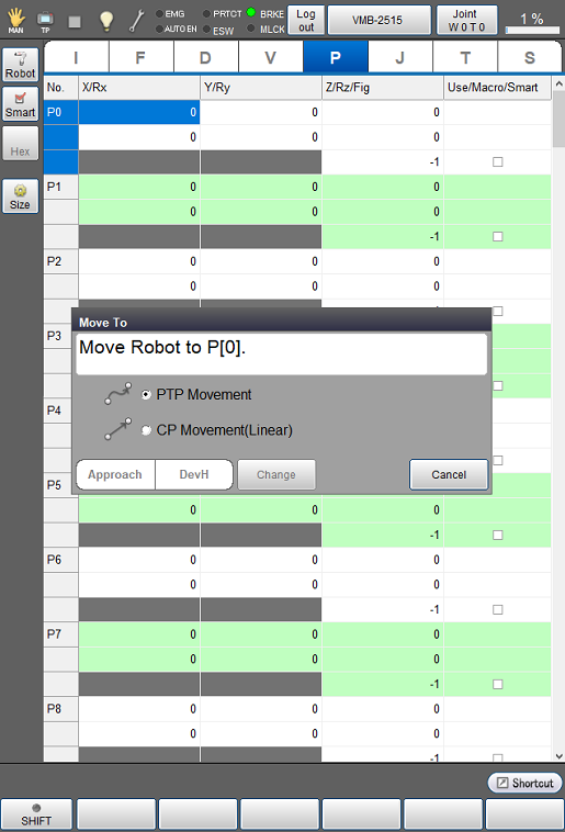 Select if the robot should be moved to the target coordinate value by "PTP Movement" or "CP Movement (Linear)".
