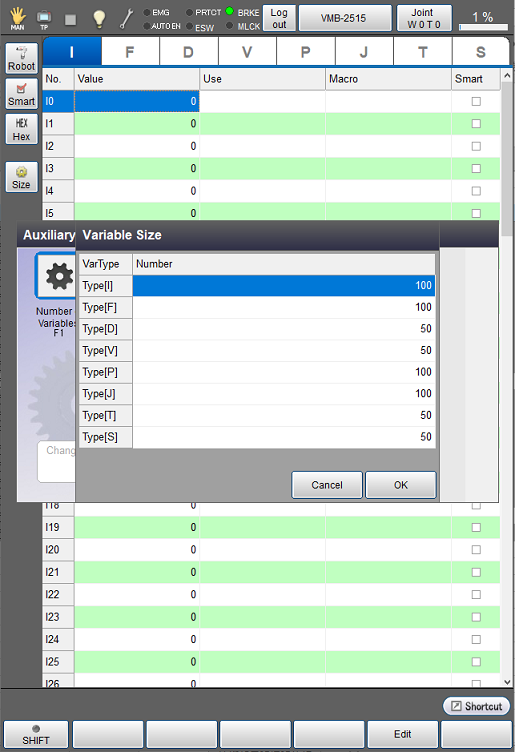 Select the variable to change its variable size, and press [Edit] to display numeric keypad. Enter the value to set with numeric keypad, and tap [OK] to change the variable size. Tap [OK] key in [Variable Size] window to confirm the changed value. |