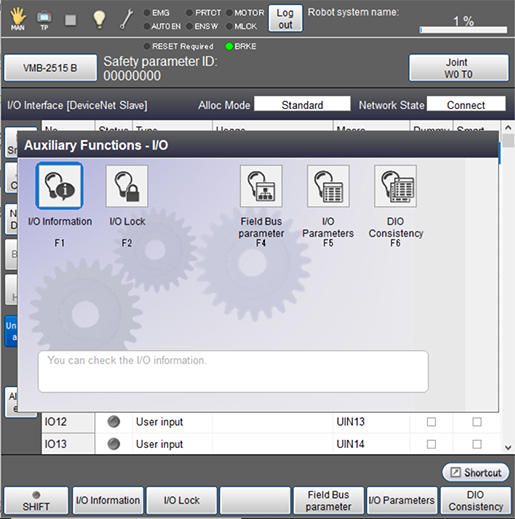 | [F6 DIO Consistency] | Check the digital I/Os cosistency between the WINCAPSIII and a robot controller. This key appears only when the currently logged-in account is granted user permission for "Programming" or "Maintenance". |