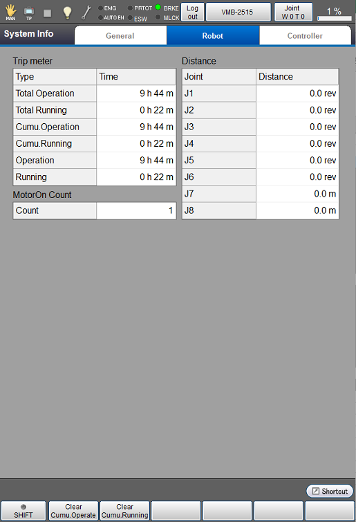 Tap [Robot] tab to display the following [Trip meter, MotorOn Count, Distance] window.