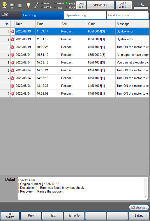 Press [F4 Operation and Error Log] to display the following [Log] window.