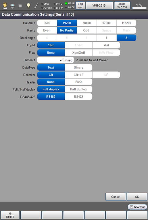 Select COM for device, and tap [F5 Edit] to display the following [Data Communication Settings] window.