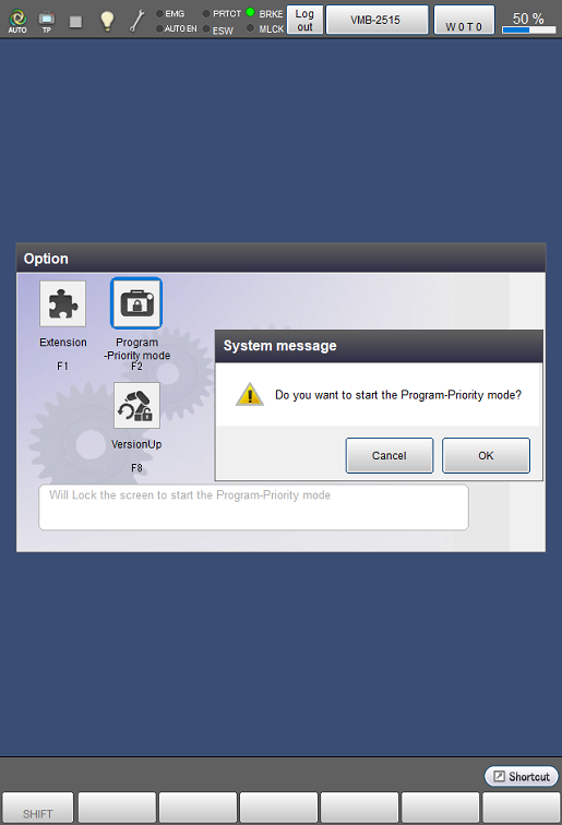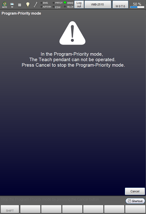 Available keys and a button under the program priority mode are Emergency stop, [Cancel] keys, [MOTOR] button, [LOCK] button, and the Cancel button on the smart TP screen.