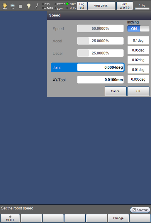 Tap velocity button on the smart TP and turn [Inching] "ON" to display the following [Speed] window.