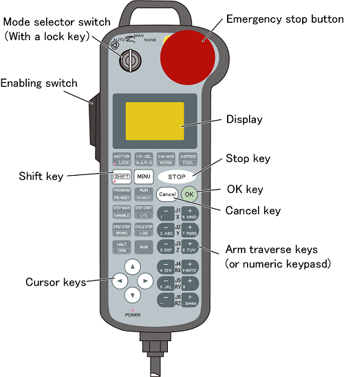 The mini-pendant is an entry/operation device for operating the robot manually, starting programs, and teaching. It has no programming function.