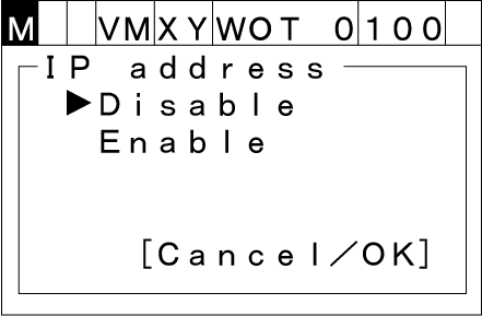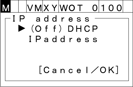 Choose [IP address] with the up and down cursor keys and then press [OK]. IP address setting screen appears as shown below.