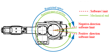 A mechanical end refers to a mechanical limit of motion and is set by a mechanical stopper. To prevent a collision with a mechanical stopper, a software limit is set just before the mechanical end. The sixth axis has no mechanical stopper but a software limit has been set.