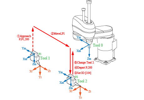 As illustrated in the figure below, End-effector 1 will be mounted by "Set IO [104]." "Depart P,200" will make the robot apart from P1 and CHANGETOOL 1 switches the tool coordinates from TOOL0 to TOOL1.