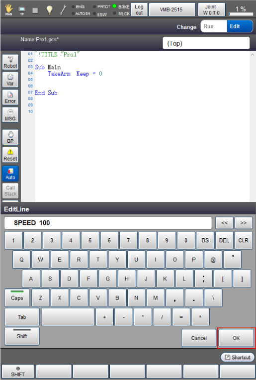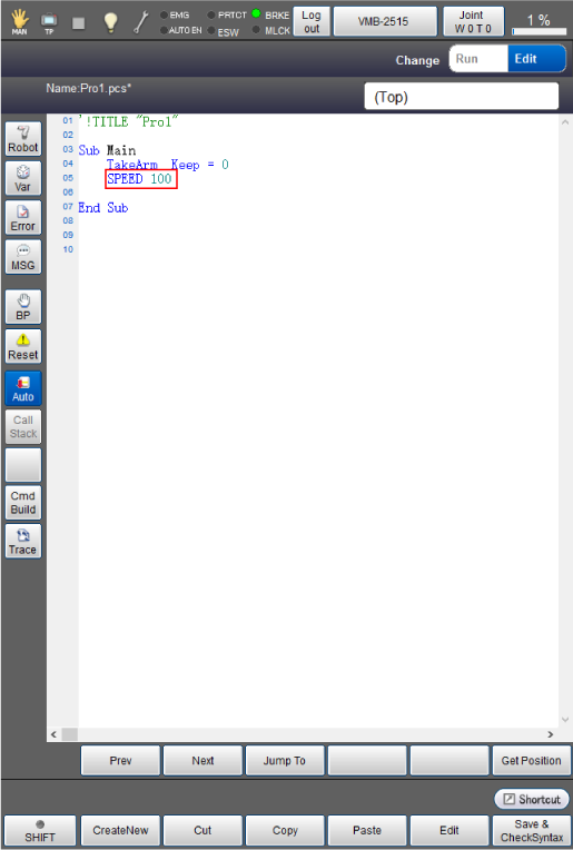 The program edit window "Pro1.pcs" is displayed and "SPEED 100" is displayed in the 5th line.