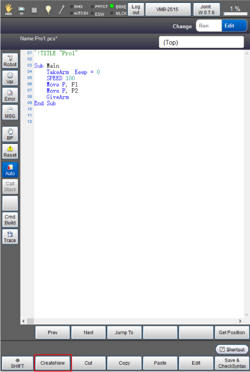 In this step, you will create a program to move from P1 to P2. Enter the program codes listed in the table below.