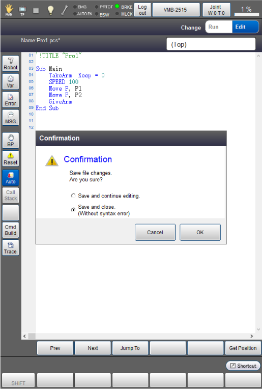 In this example, select "Save and close(Without syntax errror)" then press [OK].