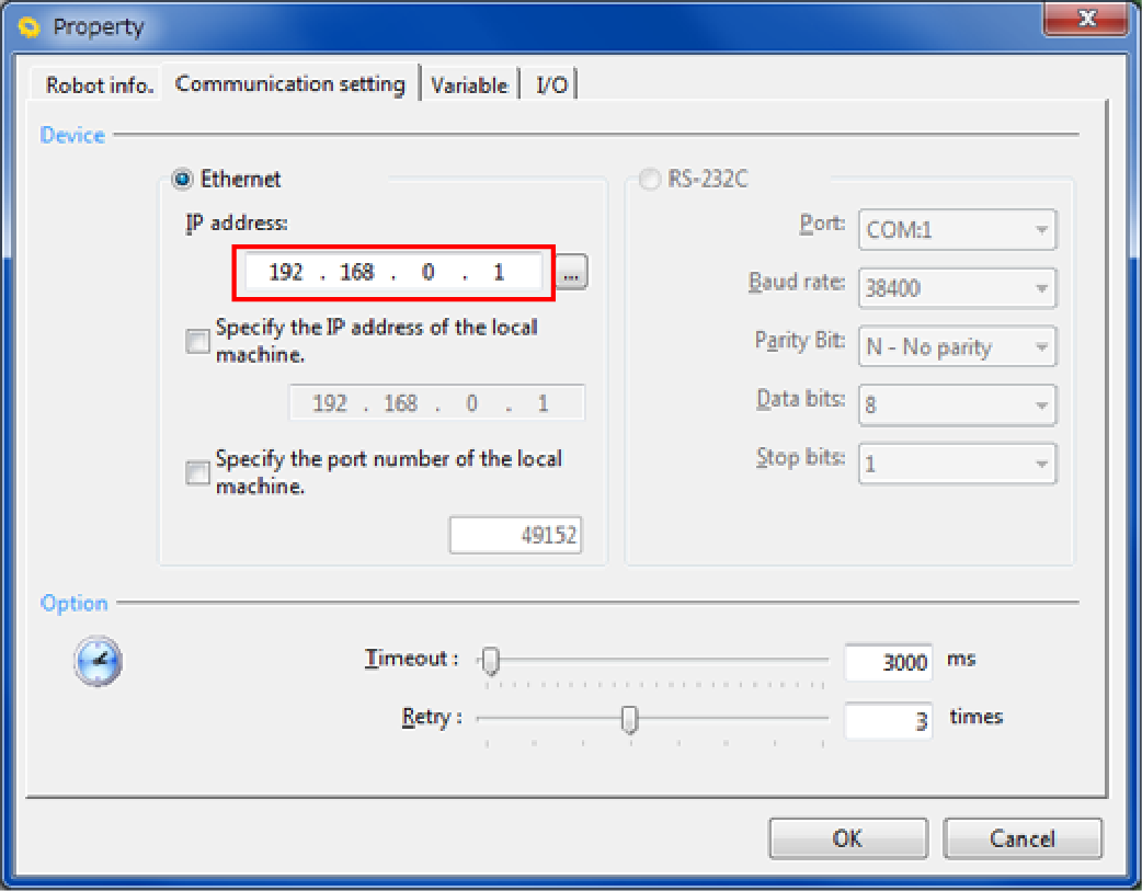 Make sure that Ethernet is selected and enter the IP address of the robot controller.