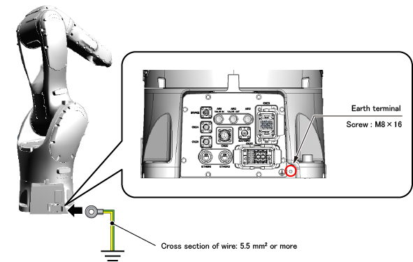 The earth terminal of the robot unit has a screw (M8×16). Use this screw to ground with a wire of 5.5 mm² or more.