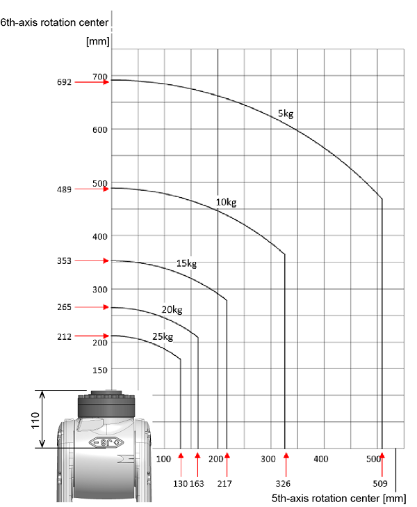 The following graph shows the allowable relationship among the center of gravity of the total load on the flange, the distance from the 6th-axis rotation center, and the distance from the 5th-axis rotation center, for respective mass.