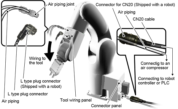 In the Signal line & Air Piping specification, as the following figure shows, signal lines and air pipes are connected from the tool wiring panel to the tool. Signal lines and air pipes, which are connecting to the connector panel, are directly connected to the tool wiring panel, passing through the inside of the robot body. Therefore, you do not need to lay wires and pipes between the tool wiring panel and the connector panel.