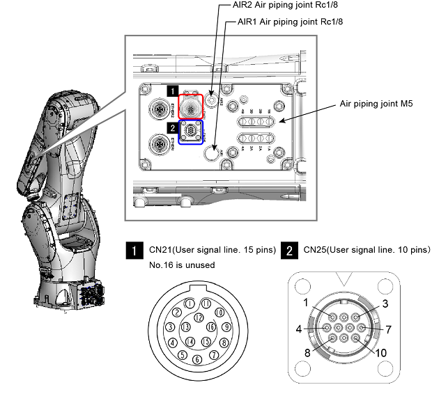 Directly connected to CN25 on the tool wiring panel. To connect signal lines, which is connecting to the tool, to the robot controller or PLC. A connector on the cable side (CN25 connector) connecting to this connector is shipped with a robot unit. However, the CN25 connector is not connected to the cable. Please connect the cable to the CN25 connector on your own. |