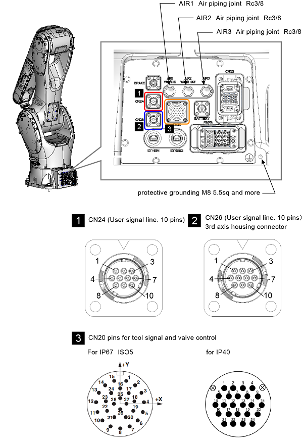 Directly connected to CN20 on the connector panel. To connect signal lines to the tool. A connector on the cable side connecting to this connector is shipped with a robot unit. However, the connector plug is not connected to the cable. Please connect the cable to the connector plug on your own. |