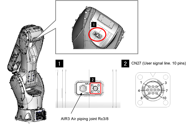 Directly connected to CN27 on the tool wiring panel. To connect signal lines, which is connecting to the tool, to the robot controller or PLC. A connector on the cable side (CN27 connector) connecting to this connector is shipped with a robot unit. However, CN27 connector is not connected to the cable. Please connect the cable to the CN27 connector on your own. |