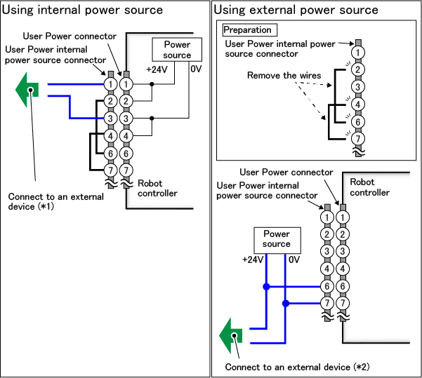The following shows the terminals on the User Power internal power source connector which is shipped as a standard item.