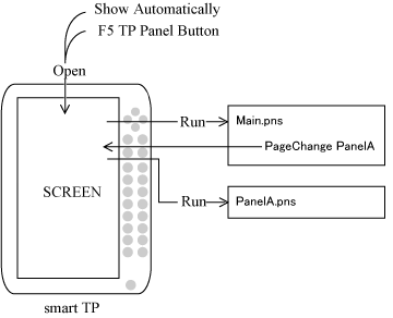 Initially displayed TP panel file is always "Main.pns" in the root (Source files). You can change the display to other TP panel files by describing PageChange statement in the TP panel task.