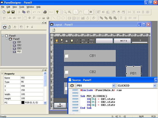 Open the Source Code Edit window, select PB1 and CLICKED to create the action source code skeleton, and add the following lines for reading the check box properties (.state).