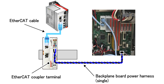 After installing the EtherCAT coupler terminal, connect the EtherCAT cable and the backplane board power harness (single) to the EtherCAT coupler terminal as below.