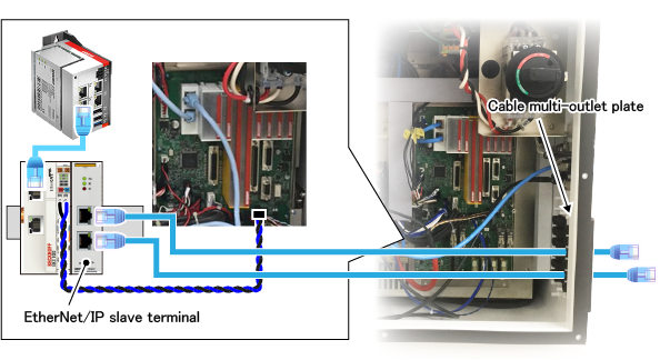 For cables connected to the EtherNet/IP slave terminal, pass them through the cable multi-outlet plate and pull out them from the robot controller.