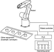 This example shown below assumes an equipment setup which allows you to run the robot by operating an external equipment’s operation panel connected via the PLC to the robot controller. It is assumed that the operating panel has a display, lamps and switches listed on the next table.