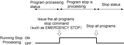 When the entire program has stopped by the stop command, such as an emergency stop, pressing STOP button, the program cannot reboot in a certain period of time (while program stop is processing). This signal turns ON in this period.