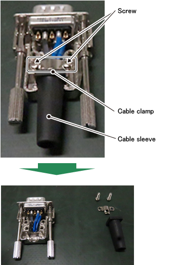 Remove two of cable clamp fixing screws, and remove the cable clamp and the cable sleeve.