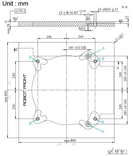 B: Holes for robot fixing bolts