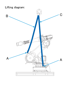 Connect the sling belt (B) and (C) to the eyebolts (A).