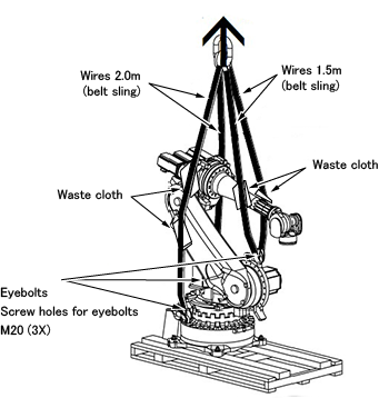 A: Eyebolt M20 If you lift a robot with a crane, put a waste cloth in a place where a wire contacts an arm and mount three eyebolts in eyebolt holes then pass a wire there as shown in the following figure.