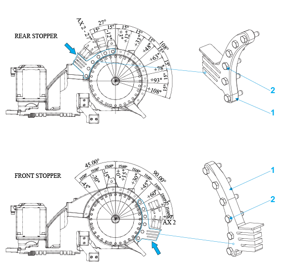 When you use adjustable mechanical stoppers (option), you can limit the stroke of the 2nd axis in units of 15° (25° for the rear stop position) in both directions.