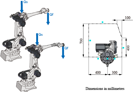 Besides the load QF on the flange, an additional load QS can be applied on the robot forearm.