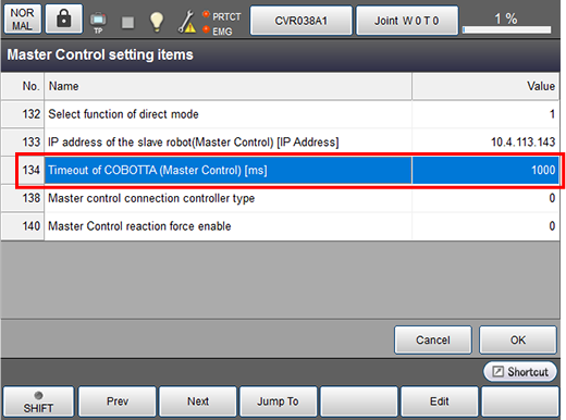 Before connecting to the slave robot, adjust a value of No.134 [Timeout of COBOTTA (Master Control)] in the [Master Control setting items] window. The recommended value is 1000 [ms].