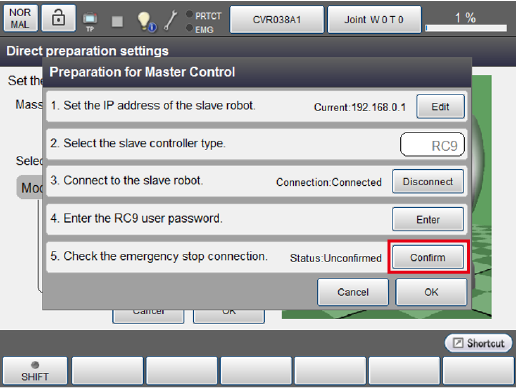 Press 5:[Confirm] and check the connection status of the emergency stop.
