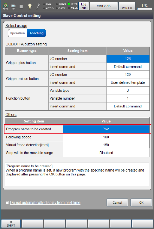 This is a support function of programming to automatically insert a command according to setting when pressing a button on the arm of COBOTTA. You can use this function if "Teaching" is selected in the usage of the slave control setting.