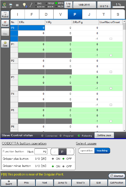 This is a function to read the current position into the variable number of the specified variable type when pressing the function button of COBOTTA. You can use this function if "Teaching" is selected in the usage selection.
