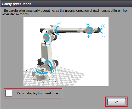 At the initial setting, this window is displayed every time the controller is turned on. If you touch the check box of “Do not display from next time” to select, this window will not be displayed from next time the controller is turned on. This function is available in Ver.1.1.* or higher.