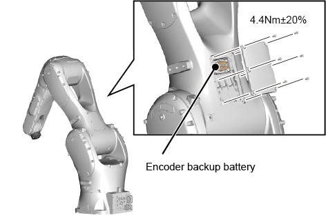 | Encoder backup battery | Retains back up the position data of the servomotor encoder. | Encoder backup battery box on the 1st arm of the robot |