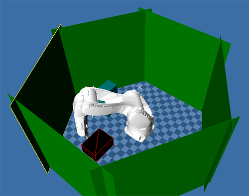 The Virtual Fence is a collision prevention function. Monitoring target objects, such as robots, tools, and equipment, are modeled by WINCAPSIII.