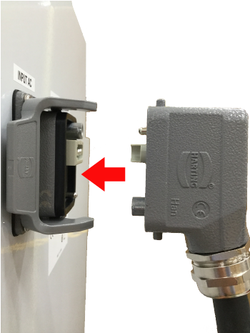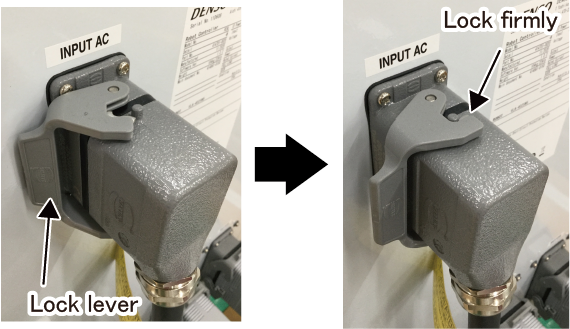 Insert the AC power cable connector straight into the robot controller's AC power connector, and move the lock lever to lock them.