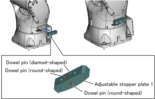 Insert the dowel pin (diamond-shaped) and dowel pin (round-shaped) into the adjustable stopper plate 1 and fix in the position of the figure below.