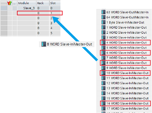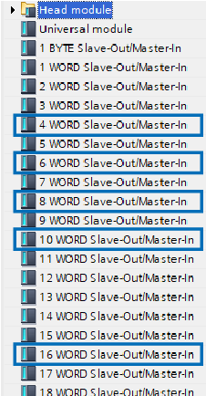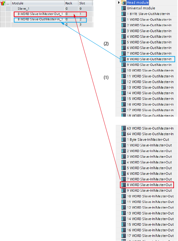 The following example shows when setting 16-byte for each input/output. Add the 8-word module for both input/output.