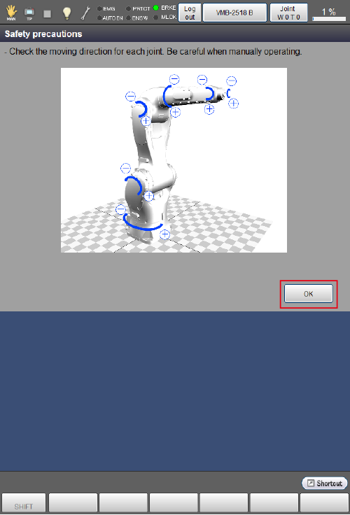 When the controller is turned on, at first, the “Safety precautions” window that shows each robot joint motion direction is displayed. Some robots have different joint motion directions, so check motion directions of each joint in this window to use a robot safely.