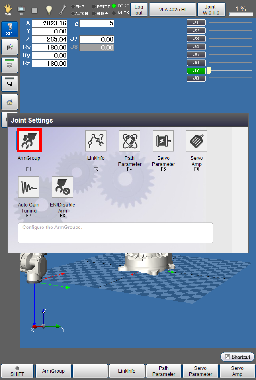 Operation path: Top screen - [F2 Arm] - [F12 Maintenance] - [F10 Joint Settings] - [F1 ArmGroup]